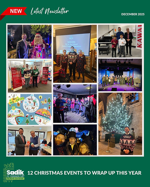 I believe in being present through regular constituency surgeries and informal "Coffee with Sadik" meetings where we can discuss matters important to you. I can also hold virtual surgeries, and am happy to attend events or meet businesses where and when I can!
